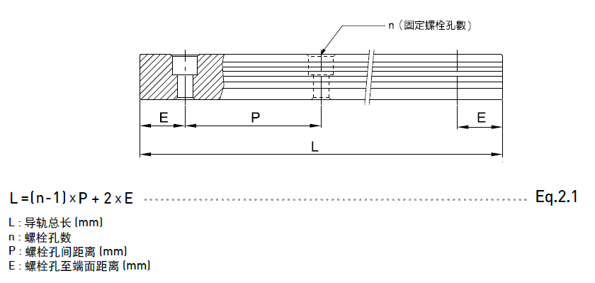 HIWIN 備有導軌標準長度庫存供應客戶需求。若客戶訂購非標準長度導軌時,端面距離E的尺寸最好不要大于1/2P,防止因E的尺寸過大導致導軌裝配后端部的不穩定,而降低直線導軌的精度。