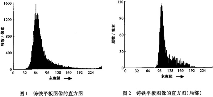 (2)鑄鐵平板的采樣圖像,其直方圖呈不對稱的單峰形狀(圖1),如果只考慮基本均勻的局部區域,其直方圖形狀稍好一些,但仍是不對稱的單峰狀(圖2);